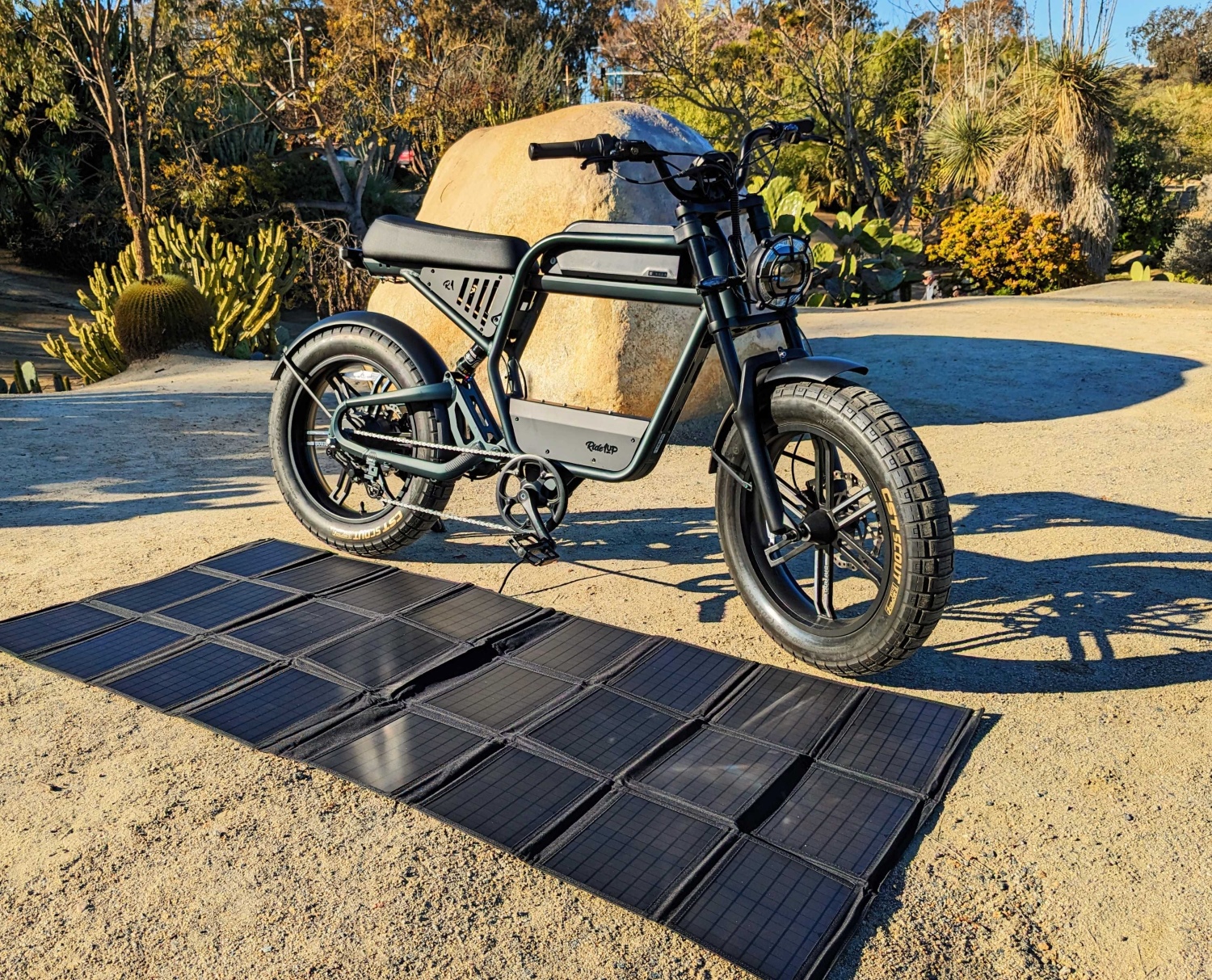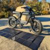 The Ride1Up solar charger is an effective and versatile way to charge your ebike in the great outdoors – no plugs, no problem!